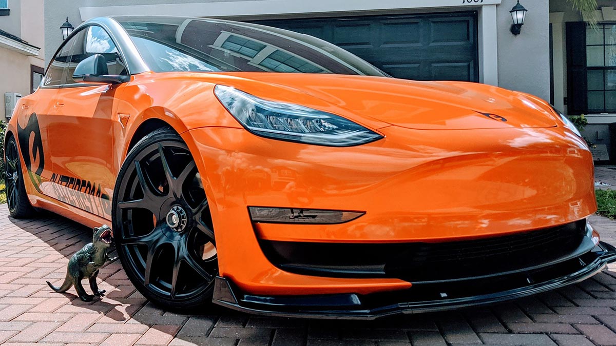 Tangerine Dream by Oracal is the actual name of the wrap color applied to this Tesla Model 3 — according to the owner, just the wrap job on this vehicle cost him $3,500 — the total cost of all the current customizations on this car is $10,000 that includes the following in addition to the tangerine wrap: