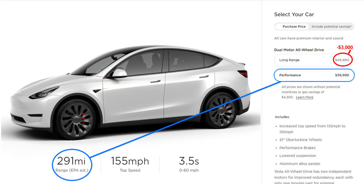 The optional Performance Upgrade Package that included some extra upgrades for the Model Y Performance for no extra cost has now been included when ordering and the customer does not get the option to get a basic Performance variant, just the badass one that previously had a 280-mile range and just received an 11-mile bump with the latest changes.