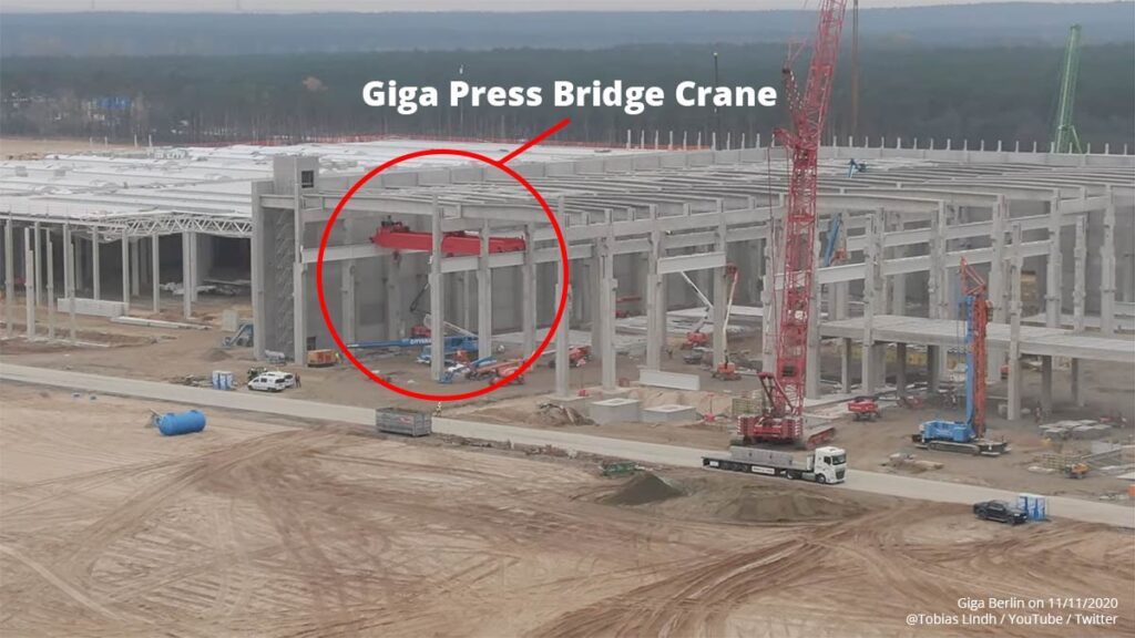The Giga Berlin construction progress is actually moving full speed ahead. When we last saw the Giga Press shop last month, only the footings of the giant press machines were completed. Now in the latest pictures and videos (below), we can witness a bridge crane already being installed in this area.