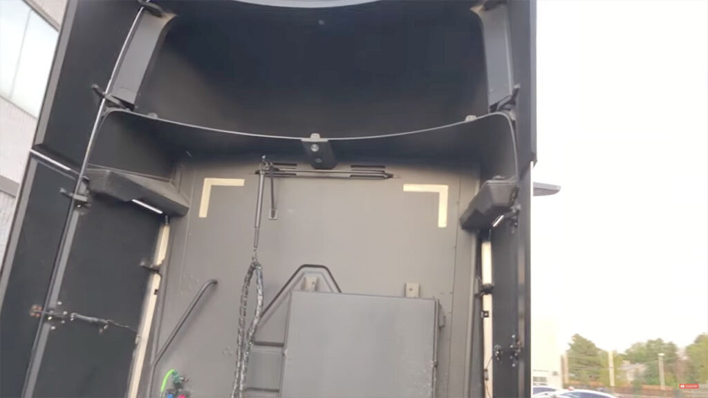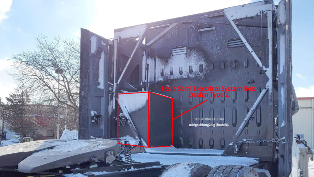The following two photos of the rear area of the Tesla Semi Truck show two variations of an electrical systems box. In one prototype, the box looks like a rectangular chest placed in the middle. The other prototype’s electrical system casing is more rectangular and smaller in size, it’s also placed on the left side rather than the middle.