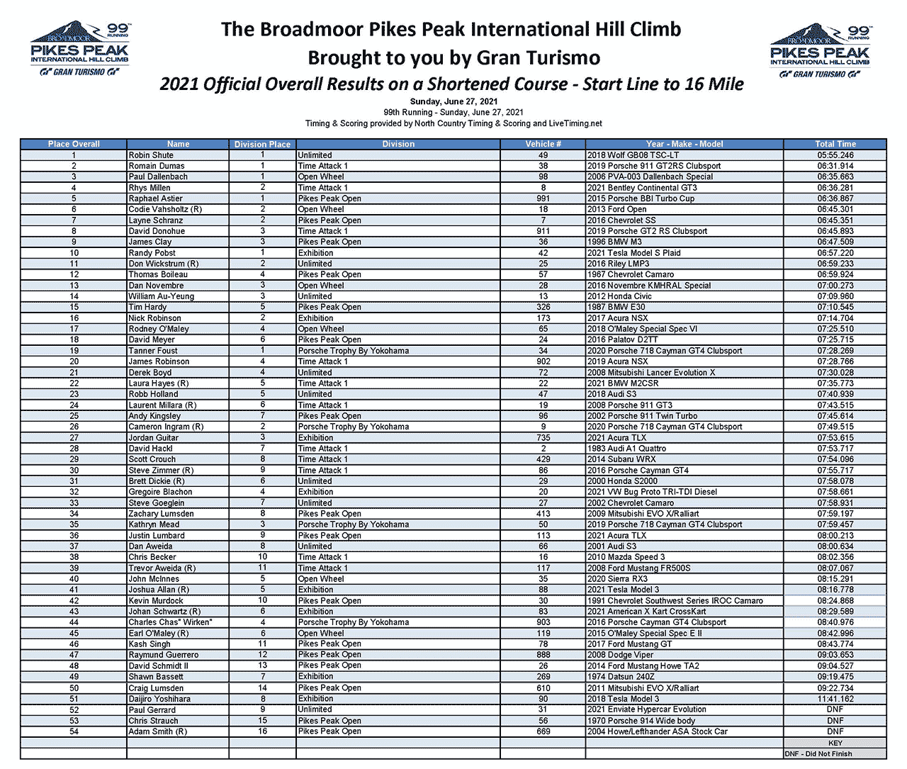 Overall results of the 2021 Pikes Peak International Hill Climb final run. The course was shortened to 16 miles due to weather conditions. Source PDF: PPIHC.org.