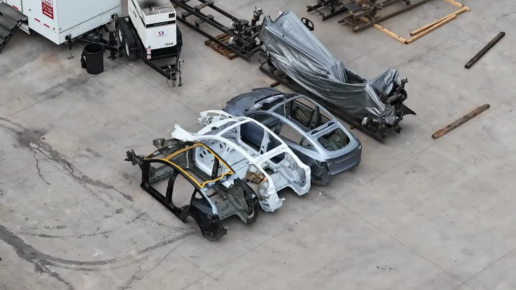 However, as the factory opened today, two Tesla Model Y body-in-white (BIW/body frames) were spotted in the open during the drone video coverage by Joe. One of these is the legacy Model Y that comes with the 2170 cells, the other BIW is of the 4680-cell & structural battery based (the one with the blank floor as the seats are integrated with the structural battery pack and installed as one unit [pictured above]).
