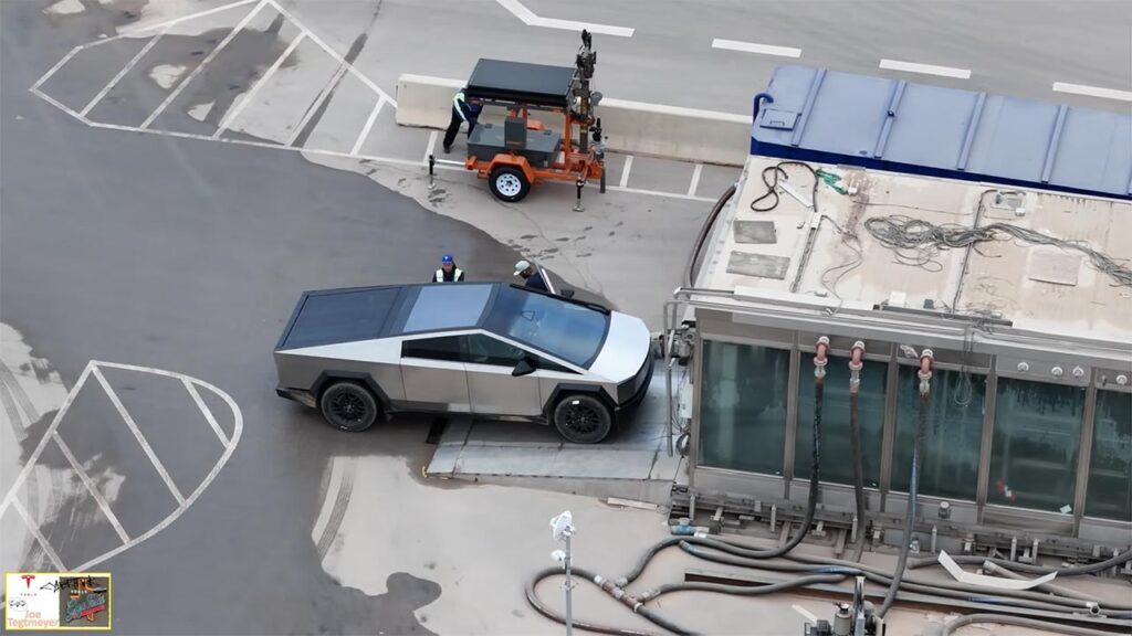 We can also see that a Cybertruck is waiting on the ramp outside this rain-maker device to enter. Unfortunately, Giga Texas observer Joe Tegtmeyer wasn’t able to record the Cybertruck entering the container.