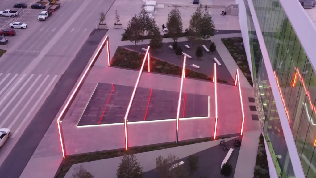 During the drone video coverage of Giga Texas yesterday by both local observers, caught day and evening footage of the Cybertruck Delivery Event light tunnel entrance. I liked it when the lights were ON in the evening — the base red lighting with white strips on the angular bars makes a beautiful combination.