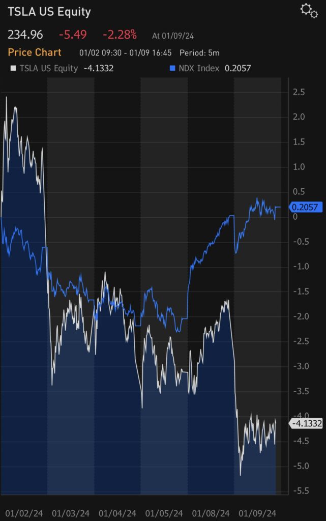 Tesla struggling the past few days as investors worry about the 4Q conf call on 1/24. #1 question: Will Elon be his usual gloom-and-doom self on the call and blame the economy for 2024 TSLA estimates coming down? Or will he put his $TSLA CEO hat on and share his vision of the product plan, pricing environment, and road to 10M vehicles/year? Updates on Optimus progress would be a plus.