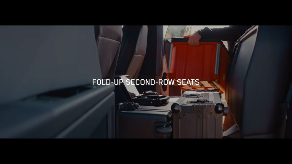 Talking about cargo space, Cybertruck has even more tricks embedded in its cabin. Tesla showed how the lower part of the Cybertruck seat can be folded up to create room for bags, suitcases, and other gear.