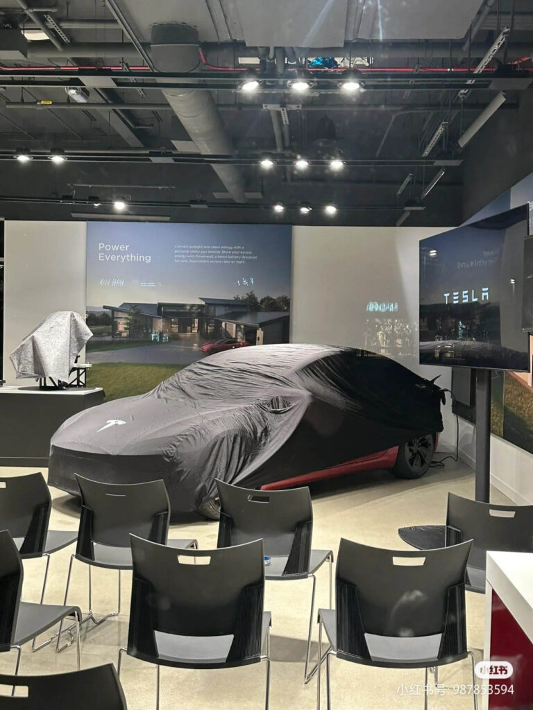 A few images surfaced online first on Chinese social media, then on Reddit, and then X (Twitter) today. These images are from a Tesla showroom. The conference room of this Tesla Store has a covered Model 3 Ludicrous parked in front of seats — ready for a presentation.