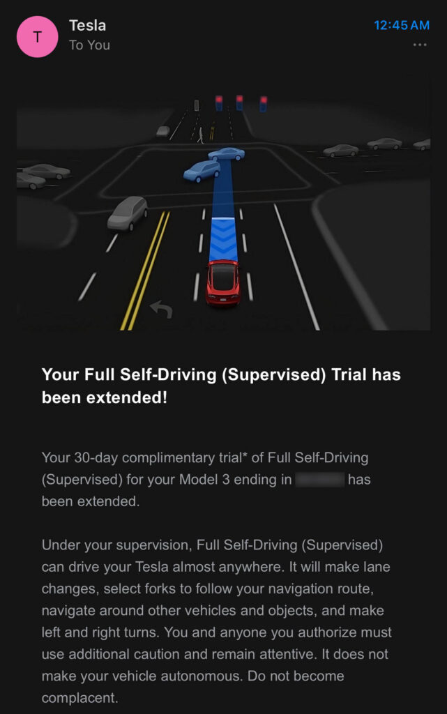“Your 30-day complimentary trial of Full Self-Driving (Supervised) for your Model 3 [Y, S, X] has been extended”.