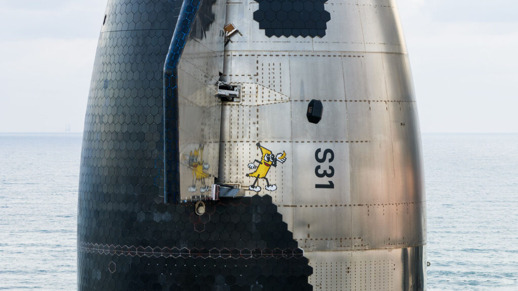 These new photos of the Flight 6 Starship are interesting and tell a story if looked at closely. For example, SpaceX published a closeup of the Flight 6 Ship 31 nosecone and forward flaps (Pic 1 above). We can see a meme artwork between the S31 marking and the flap that shows a banana cartoon holding another banana (it’s also possible that this is a large decal).