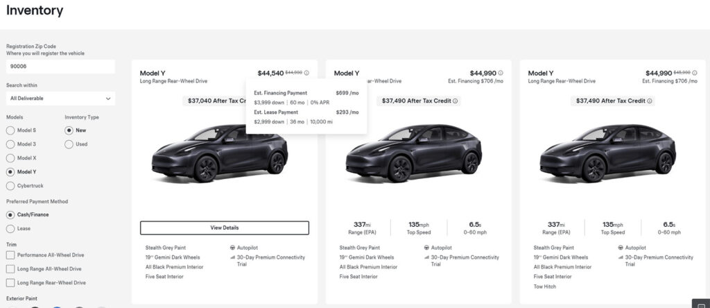 For example, the inventory has many Tesla Model Y Long Range RWD base variants availabe at the price of $44,540. If you qualify for the full $7,500 Federal Tax Credit, the vehicle’s price instantly drops to $37,040 (federal tax credit deduction is directly applied on price at the time of the vehicle purchase).