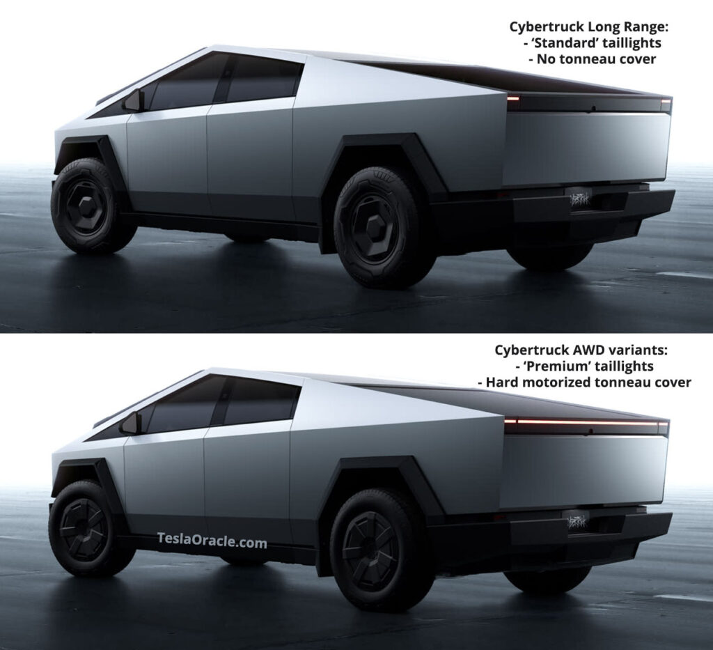 Tesla has removed the rear light bar from the tailgate of the Cybertruck Long Range. Only two small light strips are can be seen on the sides (see comparison pic below).
