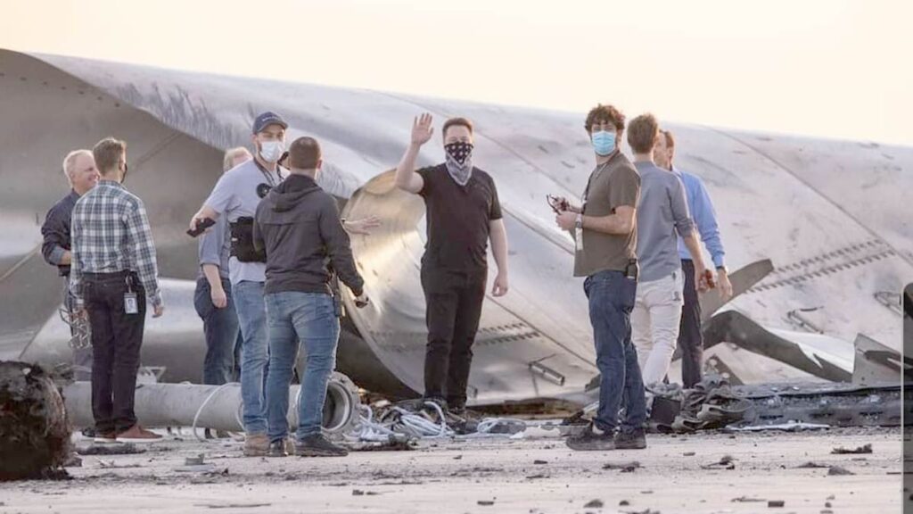 Elon Musk and the SpaceX team inspects the remains of Starship SN8